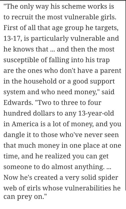 @guyroberts I freely admit I wasn't aware that there was anybody on that island over the age of 18 being exploited, so I'll grant you the benefit of the doubt there. With all the focus (rightly so) on the underage girls on the island, that detail escaped my notice.