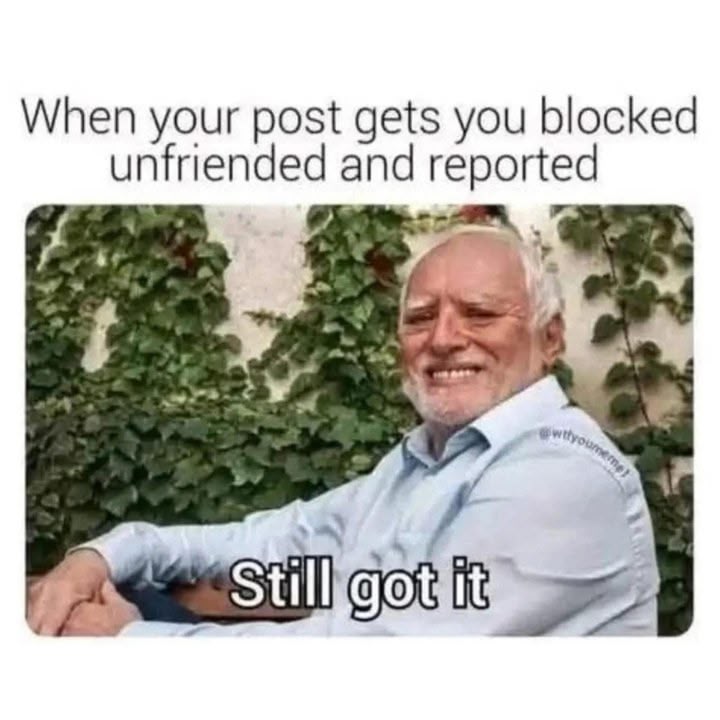 That’s exactly me 🤣 that’s why I only see like five people on here cause everybody has me blocked