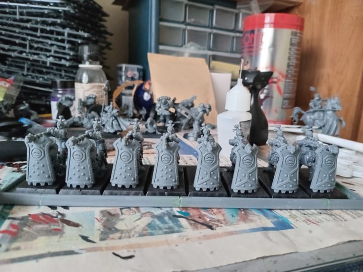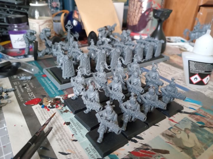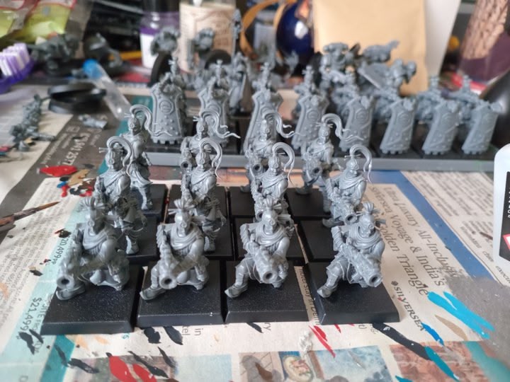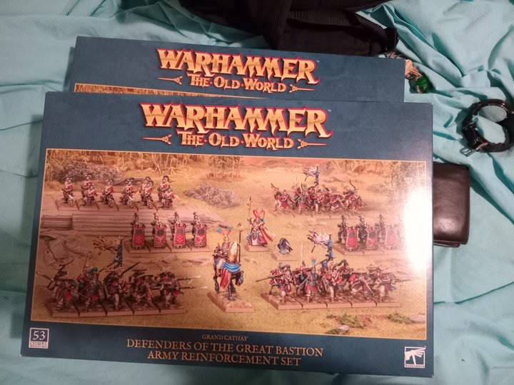The latest army set for Grand Cathay, which has Peasants, Crane Gunners, Ironhail Gunners, and a pair of Astromancers. I bought two because of my 50% discount and I am a hoarder goblin. So far I've built the Astromancers, Crane Gunners, and Ironhail Gunners from the first box, and I'm giving a friend the other set of Astromancers because I don't need that many of them.