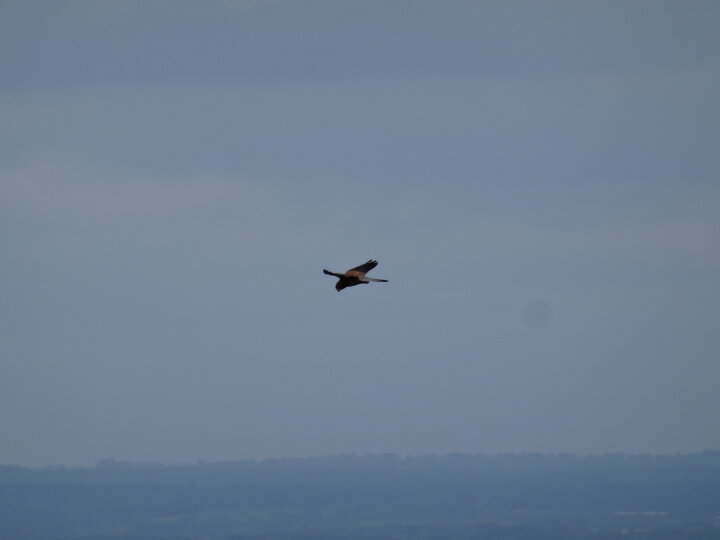 I am not an expert on birds but I think the bird is a Red Kite, partly by the colour but also it distinctive feature even in silhouette being the outline of the tail: a broad wedge shape with a deeply arcuate end.