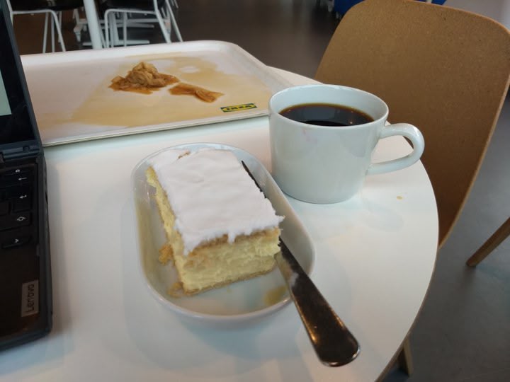 AT IKEA again. Not because I have any good reason just that I realized this morning that I needed to charge my car at a Tesla charger to avoid having to plug it in to my own supply and actually pay for it. IKEA is only ten minutes drive from the charger and it occurred to me that I haven't ad a napoleonskake since May! So here it is: