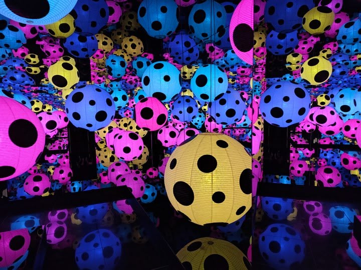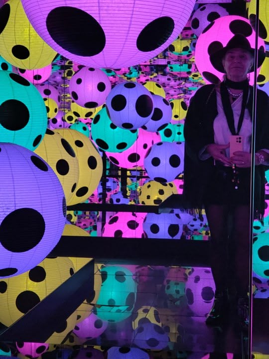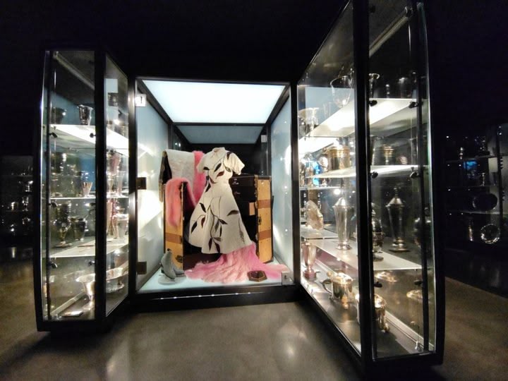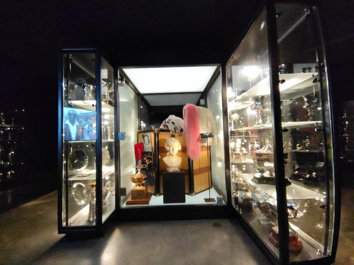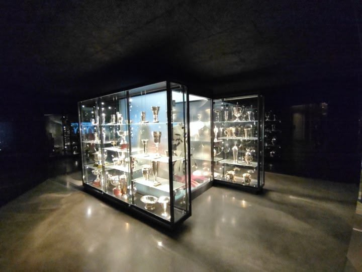 It's a dramatically lit display case filled with trophies and memorabilia in a black painted room