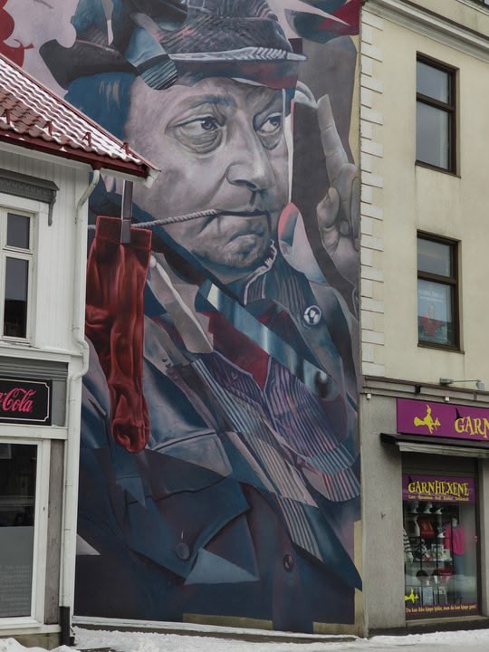 The mural is a portrait of Rolv Wesenlund ‘That socks’ (1936 – 2013) Norwegian comedian, actor, singer, writer and clarinetist.