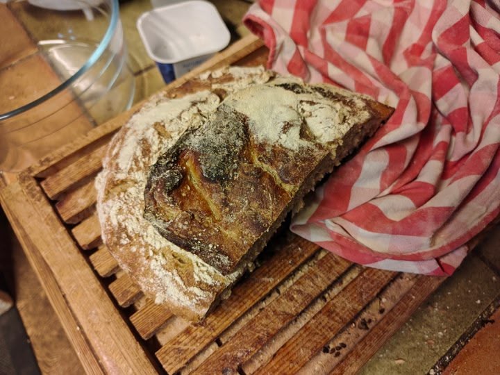 I also made a loaf of bread. This was also inspired by something seen on the web, probably YouTube. It was about a Middle Ages farming practice called maslin. Or was it just the mixture of grains that is called maslin or the bread made from it?