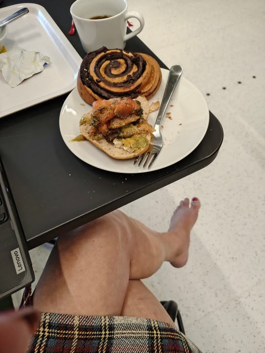 Having breakfast at IKEA Aarhus (Denmark), my least favourite IKEA. It has screens for ordering instead of counters loaded with dishes and then you have to wait for you number to show on the screen. So even though there were only half a dozen people ordering it took five times longer for me to get my frokost tallerken (breakfast plate) as it does at IKEA Slependen (Norway).