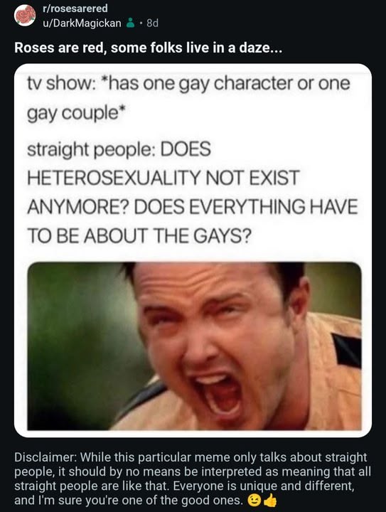 My inbox was flooded with hundreds of replies. Every. Single. Day. All of them demanding to know why it was that I was saying all straight people do that. Every single hοmοphοbic one of them taking it personally that I shared a silly little meme, without including a disclaimer saying that it's absolutely 100% not all straights. It's been 9 days, and I'm still getting people demanding to know why I didn't ruin the meme with a whole disclaimer talking about how it's only a certain type of straight people who do it. That's the level of hοmophobia disguised as personal outrage that I've been dealing with.