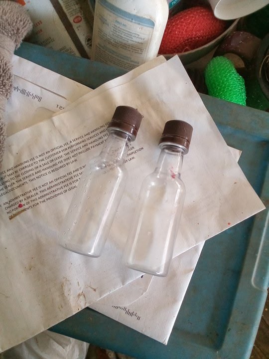 I took just two of these little alcohol shot bottles and then I put lead special purpose corn head john deere motor grease in just one's cap and then I put on these gloves and then I shuffled them up one in front of the other around and around rotation and then I lost where they were at and then I took off a glove and then I put my finger in a cap and didn't get the grease on my finger on the first prob important try for the first try for the first time and I held my breath to not smell them. I wrote down the bottle with the grease so I could remember the call longer. I am 27 yrs old. This is the first time I realized that they were 50/50 and this was a better cast than the other ones. I won this game 30min ago and I discovered that stuff today. The bottles don't have anything on them I cleaned them good.