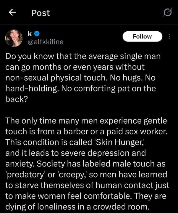 Society has labeled male touch as "predatory" or "creepy", so men have learned to starve themselves of human contact just to make women feel comfortable.