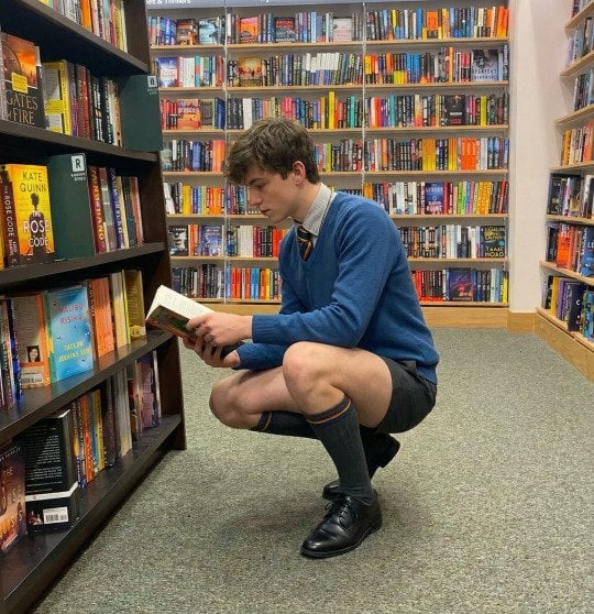 I did not own a single pair of long trousers during my boyhood. It was arranged for me to attend school in neat grey shorts until I left at eighteen. This could be me in the school library. Brief school shorts were considered to be very beneficial.