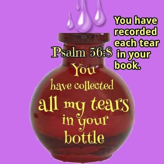 You thought he didn't see your tears today, didn't you? But he's been beside you, all along. Not only that. He felt every teardrop that fell from your eyes. He saw every last one of your tears. Each tear you cry is so precious to him, he lovingly preserves them in a jar with your name on it! That's how much he loves you.