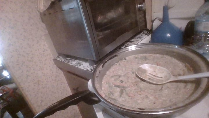 I'm spending as much time away from dad as possible, and as i wake up from a long sleep and come down to the main level, he's making barfing sounds with garbage bags all around him, there's disgusting looking food in a pan on the top of the oven, well i see more of that gross goop in a bowl on a little footrest in the living room, i ask him what this is? He tells me he made it for mom, and that she had some of it last night.