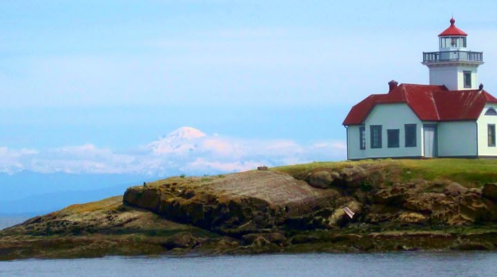 looking east toward Mount Baker, past the Patos Island lighthouse