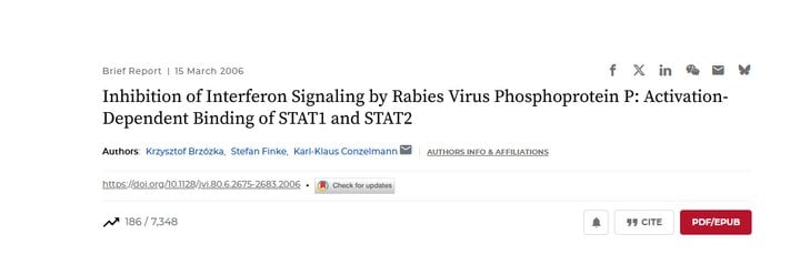 Rabies virus (RV) phosphoprotein P is an interferon (IFN) antagonist counteracting transcriptional activation of type I IFN (K. Brzózka, S. Finke, and K. K. Conzelmann, J. Virol 79:7673-7681, 2005). We here show that RV P in addition is responsible for preventing IFN-α/β- and IFN-γ-stimulated JAK-STAT signaling in RV-infected cells by the retention of activated STATs in the cytoplasm. Expression of IFN-stimulated response element- and gamma-activated sequence-controlled genes was severely impaired in cells infected with RV SAD L16 or in cells expressing RV P protein from transfected plasmids. In contrast, a recombinant RV expressing small amounts of P had lost the ability to interfere with JAK-STAT signaling. IFN-mediated tyrosine phosphorylation of STAT1 and STAT2 was not impaired in RV P-expressing cells; rather, a defect in STAT recycling was suggested by distinct accumulation of tyrosine-phosphorylated STATs in cell extracts. In the presence of P, activated STAT1 and STAT2 were unable to accumulate in the nucleus. Notably, STAT1 and STAT2 were coprecipitated with RV P only from extracts of cells previously stimulated with IFN-α or IFN-γ, whereas in nonstimulated cells no association of P with STATs was observed. This conditional, IFN activation-dependent binding of tyrosine-phosphorylated STATs by RV P is unique for a viral IFN antagonist. The 10 C-terminal residues of P are required for counteracting JAK-STAT signaling but not for inhibition of transcriptional activation of IFN-β, thus demonstrating two independent functions of RV P in counteracting the host's IFN response.