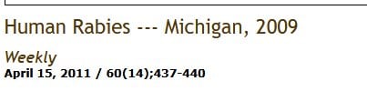 On November 9, 2009, a Michigan hospital informed CDC of suspected rabies in a man aged 55 years. The patient reportedly had awakened with a bat on his arm 9 months earlier but had not sought medical evaluation. He went to a local emergency department (ED) on October 30 and soon after was hospitalized; he died 12 days later. On November 14, CDC confirmed infection with a rabies virus variant that commonly infects the silver-haired bat (Lasionycteris noctivagans) (Figure). This report summarizes the patient's clinical course and the associated public health investigation. The report highlights the importance of public awareness of rabies, particularly among persons who might be at risk for wildlife exposures. Persons who experience contact with a bat and cannot confidently rule out a bite or scratch should seek prompt medical attention.