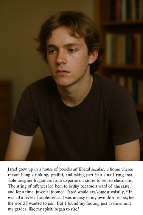 Jared grew up in a house of books and arguments, an academic, liberal, and largely secular home where reason hung in the air like moist breath on glass, and the world outside seemed at once vast and narrow. Yet even in that close, frankly intellectual household, a strange, awkward restlessness began to stir in him—a boy’s rebellion, unfocused yet tingling with the wet energy of youth.