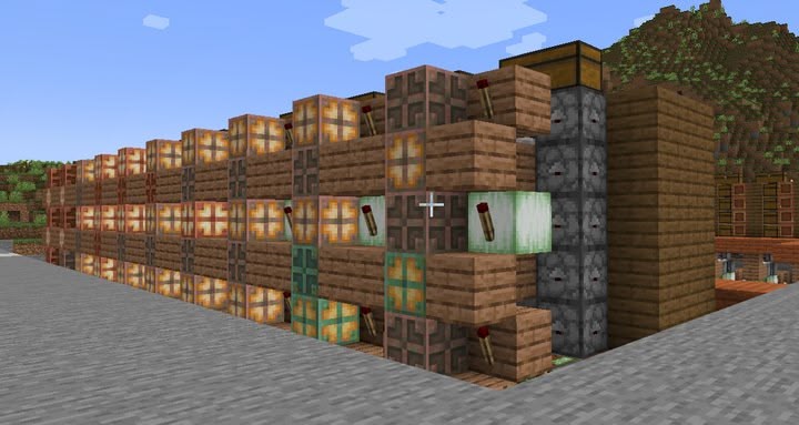 The entire item flow is finished and I added some lamps to see where items are flowing from the inside. I also started configuring where major item types should go. Wood and stone types were pretty easy, but organizing rarer items is a bit more challenging to make sense and findable.