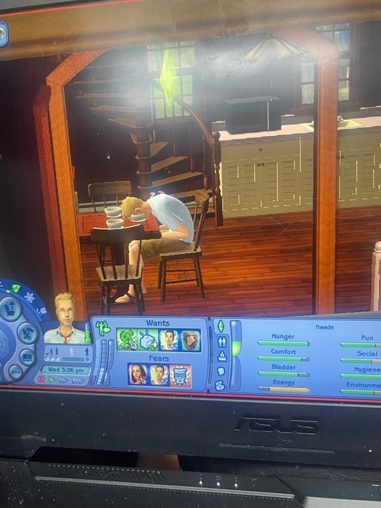 This pic is from the sims 2. My sims son is going to walk in on his father passed out after school, 3 bowls of Mac and cheese deep because both his hunger and energy were low,