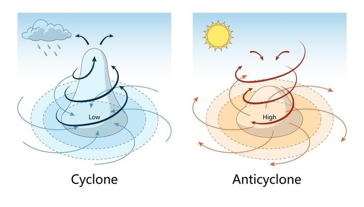 @Nightwings Rather complicated by the look of that. Thank you. From BYJU'S online education site. A cyclone is an area of low pressure where air masses meet and rise. An anticyclone is an area of high pressure where air moves apart and sinks.